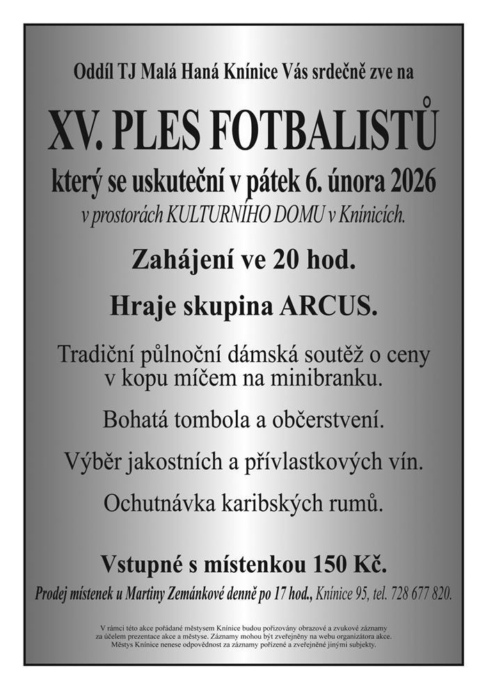 Oddíl TJ Malá Haná Knínice Vás srdečně zve na XV. PLES FOTBALISTŮ, který se uskuteční v pátek 6. února 2026 v prostorách Kulturního domu v Knínicích. Hraje skupina ARCUS. Program: Tradiční půlnoční dámská soutěž o ceny v kopu míčem na minibranku. Bohatá tombola a občerstvení. Výběr jakostních a přívlastkových vín. Ochutnávka karibských rumů.