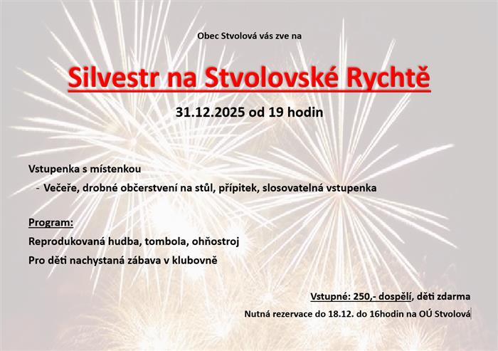 Obec Stvolová vás zve na Silvestr na Stvolovské Rychtě 31.12.2025 od 19 hodin.