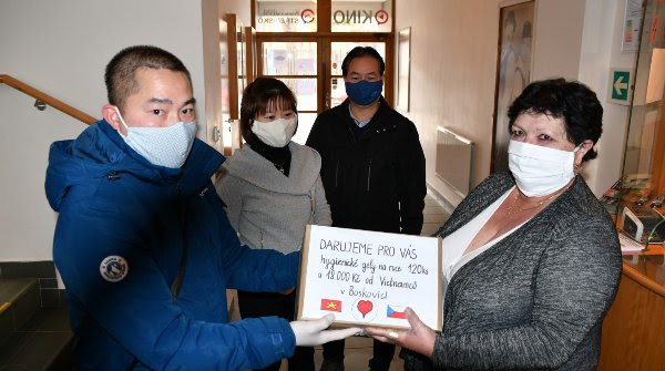 Vietnamská obchodní asociace v Boskovicích zastoupená Pham Hong Nhung, Truong Cong Chinh a Do Xuan Huu předala na sběrné místo do kina v rámci boje proti šíření koronaviru dar městu Boskovice ve formě hygienických gelů a dezinfekcí.