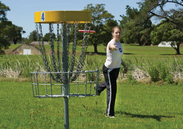 Disk se hází z určeného výhoziště na cíl, ten už dnes většinou tvoří ocelový koš s řetězy. Průměrná délka jamky (tedy vzdálenost mezi výhozištěm a cílem) bývá kolem 80–120 metrů a dá se časem dosáhnout třemi (případně i dvěma) hody. Po prvním hodu z výhoziště hráč hází druhý hod z místa, kde se disk zastavil a pokračuje, dokud netrefí cíl. Hráč si na každý hod vybírá disk, který se mu hodí (podobně jako golfista mění hole). Hřiště bývá navrženo tak, aby se hráči museli potýkat s přírodními překážkami, jako jsou stromy, keře, kopce, případně vodní plochy. Vítězem je ten, kdo dokončí celé hřiště. Na rozdíl od klasického golfu sport nevyžaduje drahé vybavení, a především ze začátku je snadno dostupný. Discgolfové hřiště může být všude, kde je dostatek místa a vhodný terén. Ideální jsou větší městské parky, nebo příměstské oblasti s volnými i křovinatými plochami místy porostlými stromy.